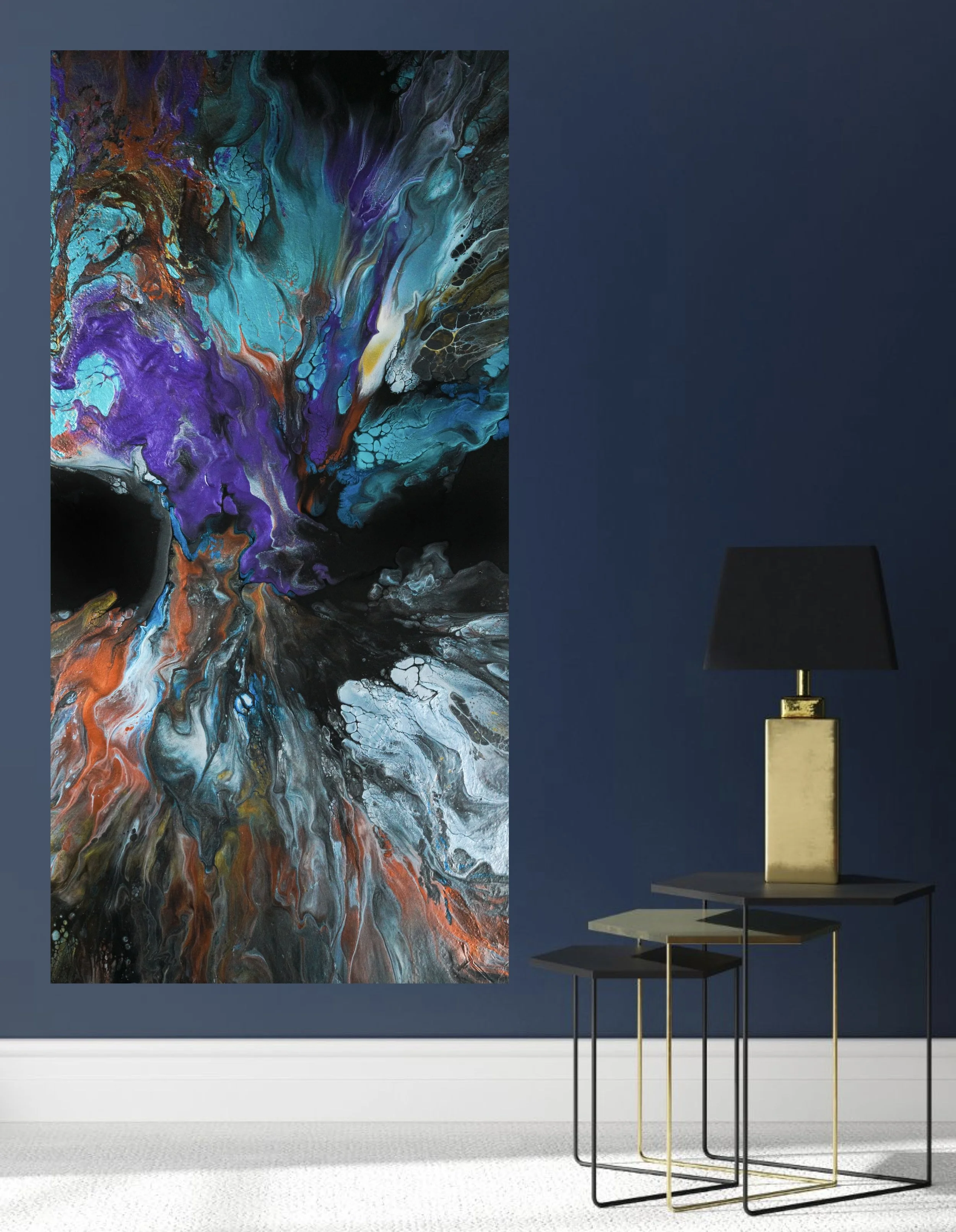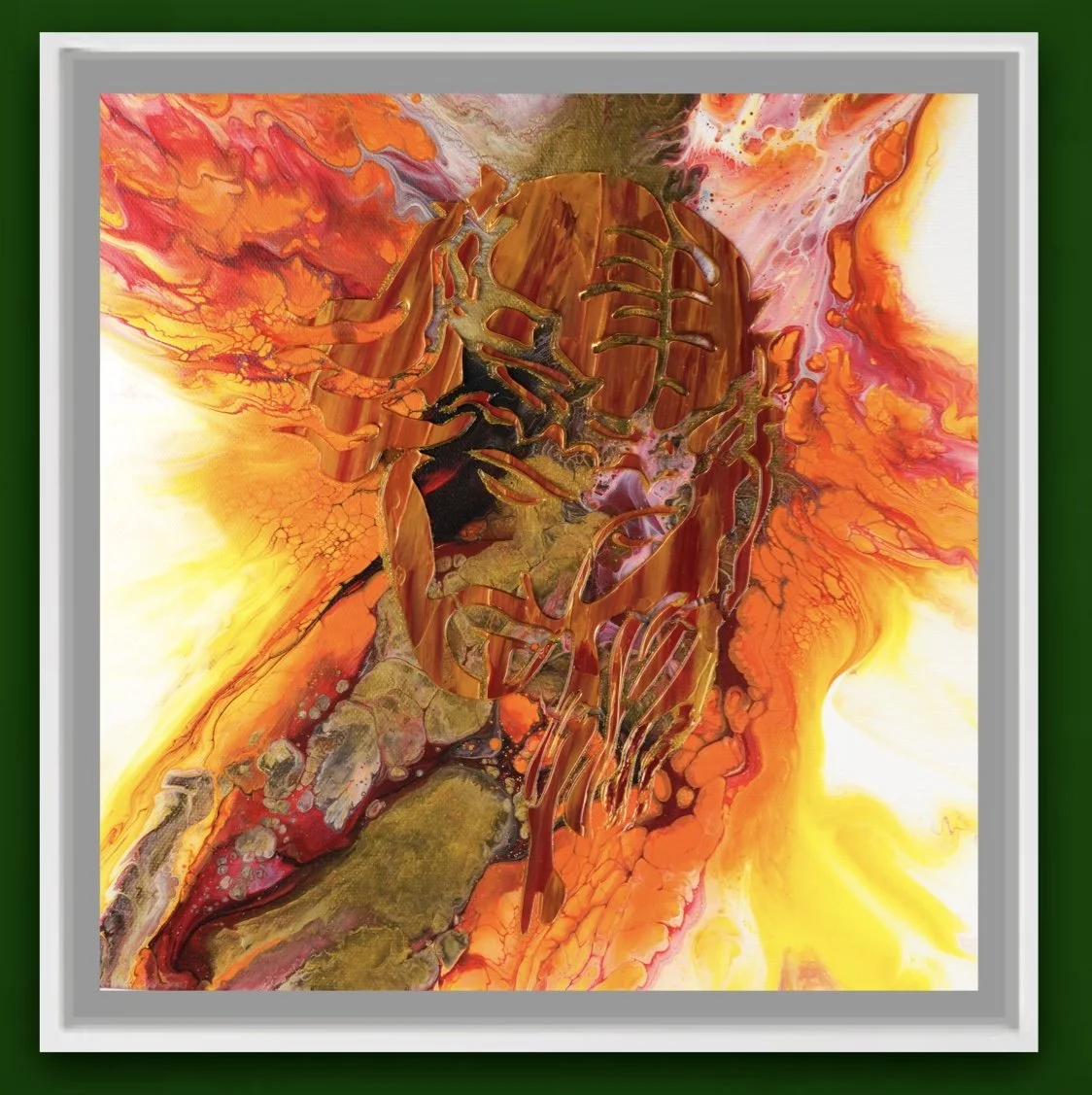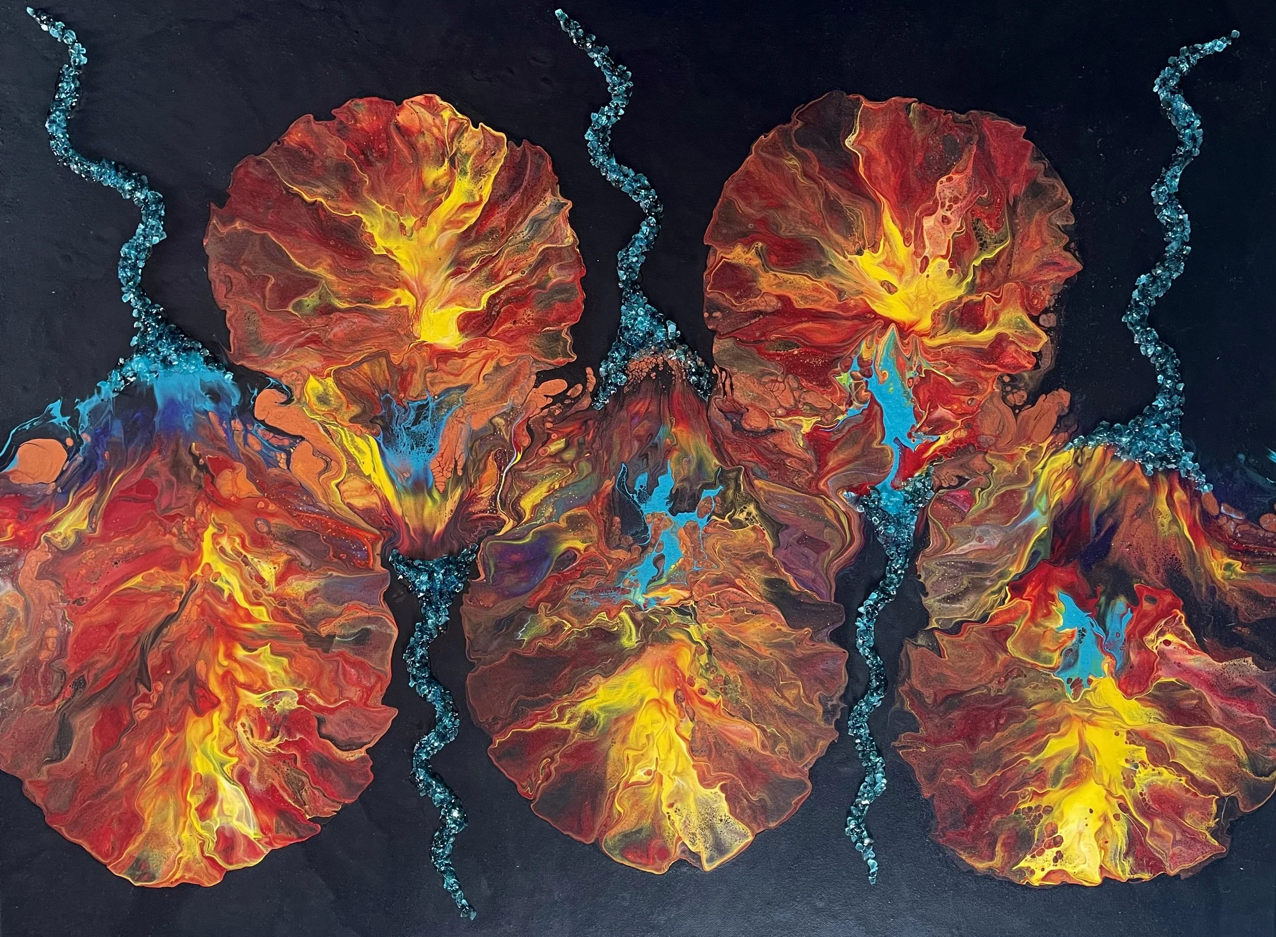 The series features fluid paintings utilizing multiple techniques and materials. The process is very experimental and it is created when the pigment is poured and it runs free. The results are psychedelic, organic and often times surprising. There are no two alike as the paint independently runs over the canvas creating movement and emotions. Almost all my creations are finished with art resin. Recently, I started experimenting with mixed media, incorporating broken glass, pebbles, and acrylic skin to my creations.