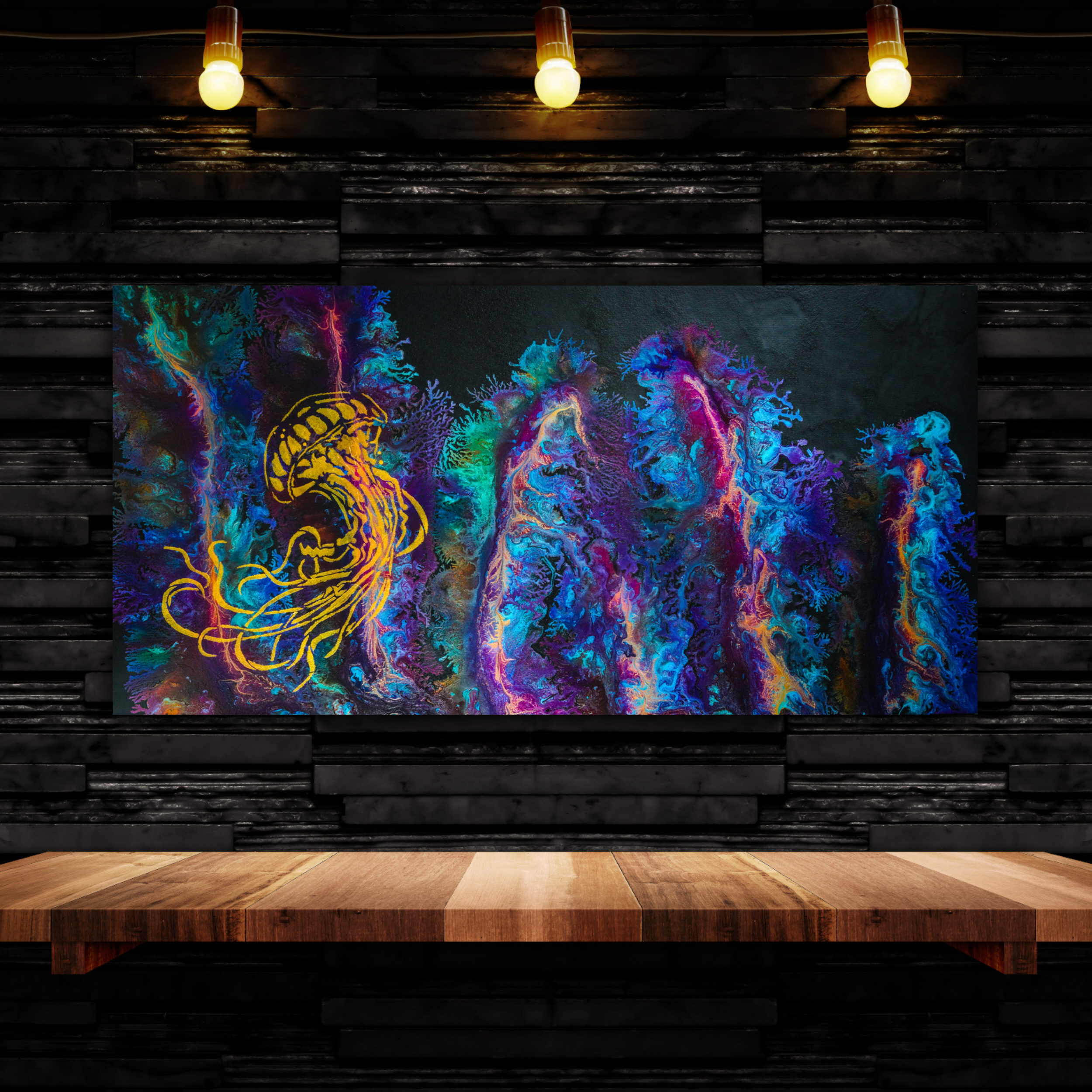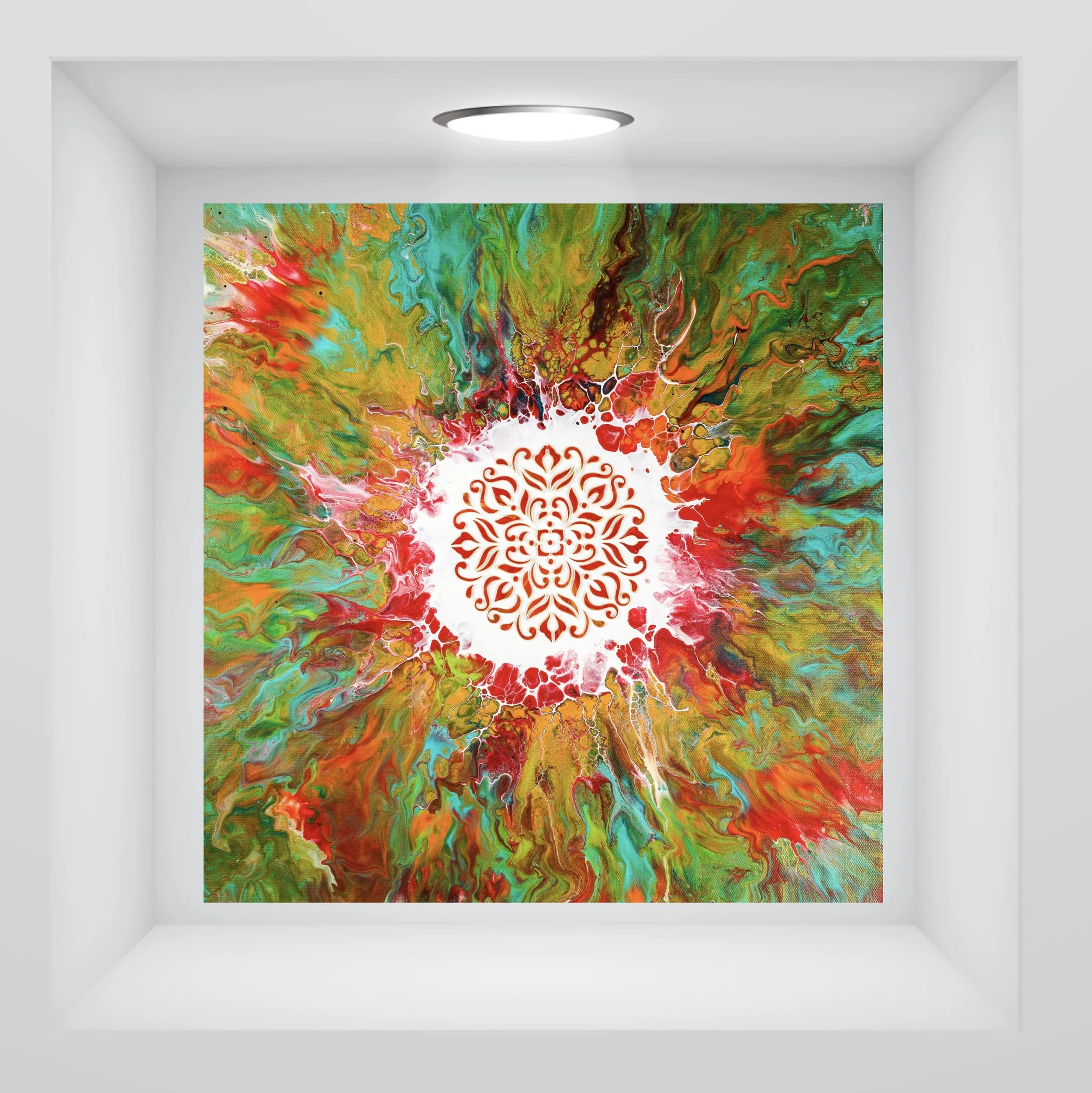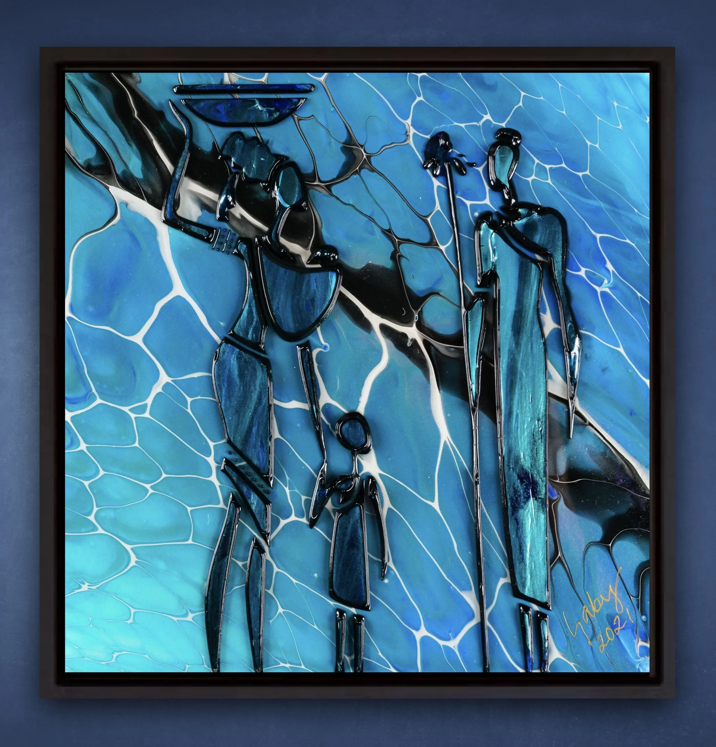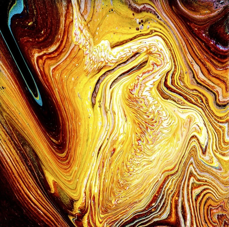The series features fluid paintings utilizing multiple techniques and materials. The process is very experimental and it is created when the pigment is poured and it runs free. The results are psychedelic, organic and often times surprising. There are no two alike as the paint independently runs over the canvas creating movement and emotions. Almost all my creations are finished with art resin. Recently, I started experimenting with mixed media, incorporating broken glass, pebbles, and acrylic skin to my creations.